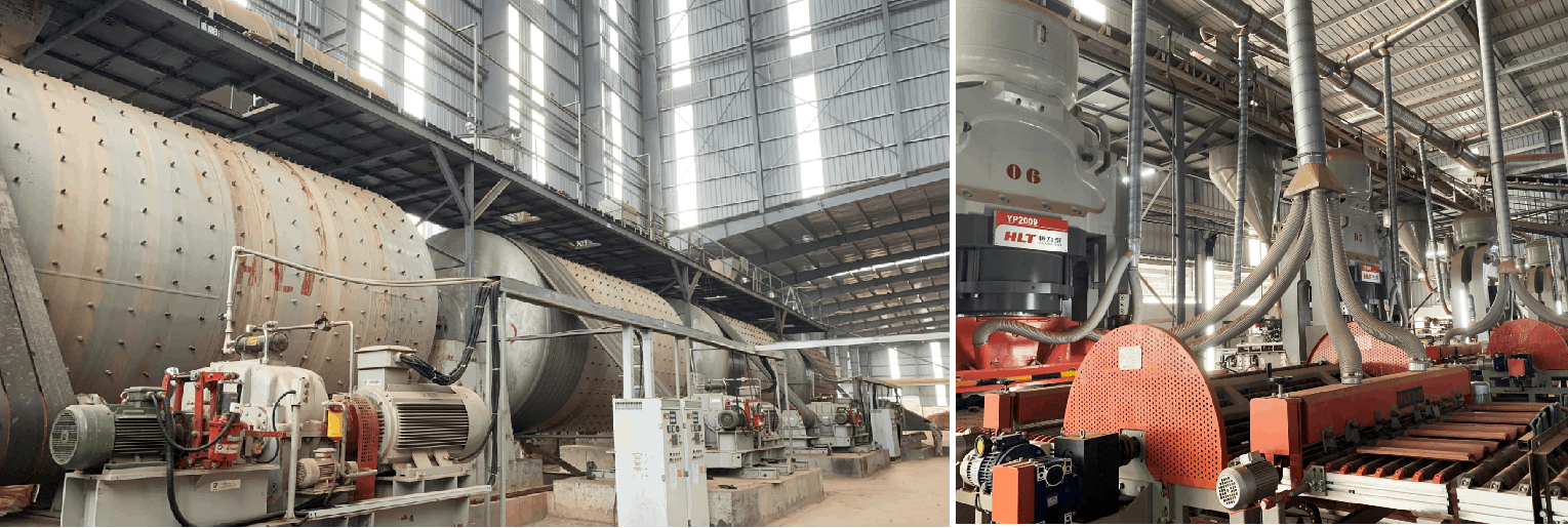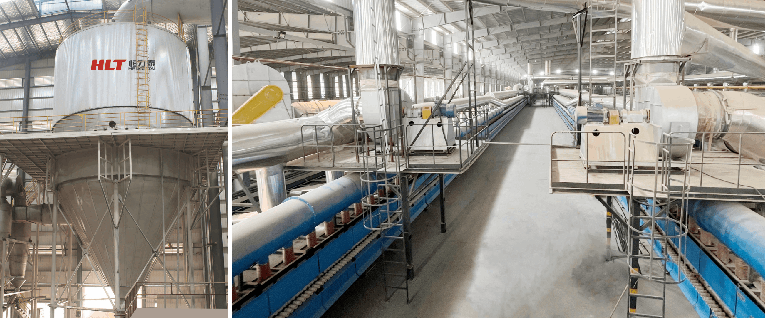 This project involves various components, including 4 sets of HLT Technology's 60T energy-saving intermittent ball mills, FaST series PST-12000 intelligent spray towers, and complete-line machinery for the glaze workshop. Additionally, there are 3 units of HLT Industry's YP3009T automatic hydraulic presses, DLT Technology's Industry "4.0 energy efficiency benchmark" roof tiles firing kiln (W3100/L268.8M), EM series five-layer recirculating dryers (W3200/L64.4M), pre-kiln drying and glazing lines, and other complete sets of auxiliary machinery. The primary production specifications are for high-end roof tiles measuring 325*425mm, with a designed daily output of 150,000 pieces.