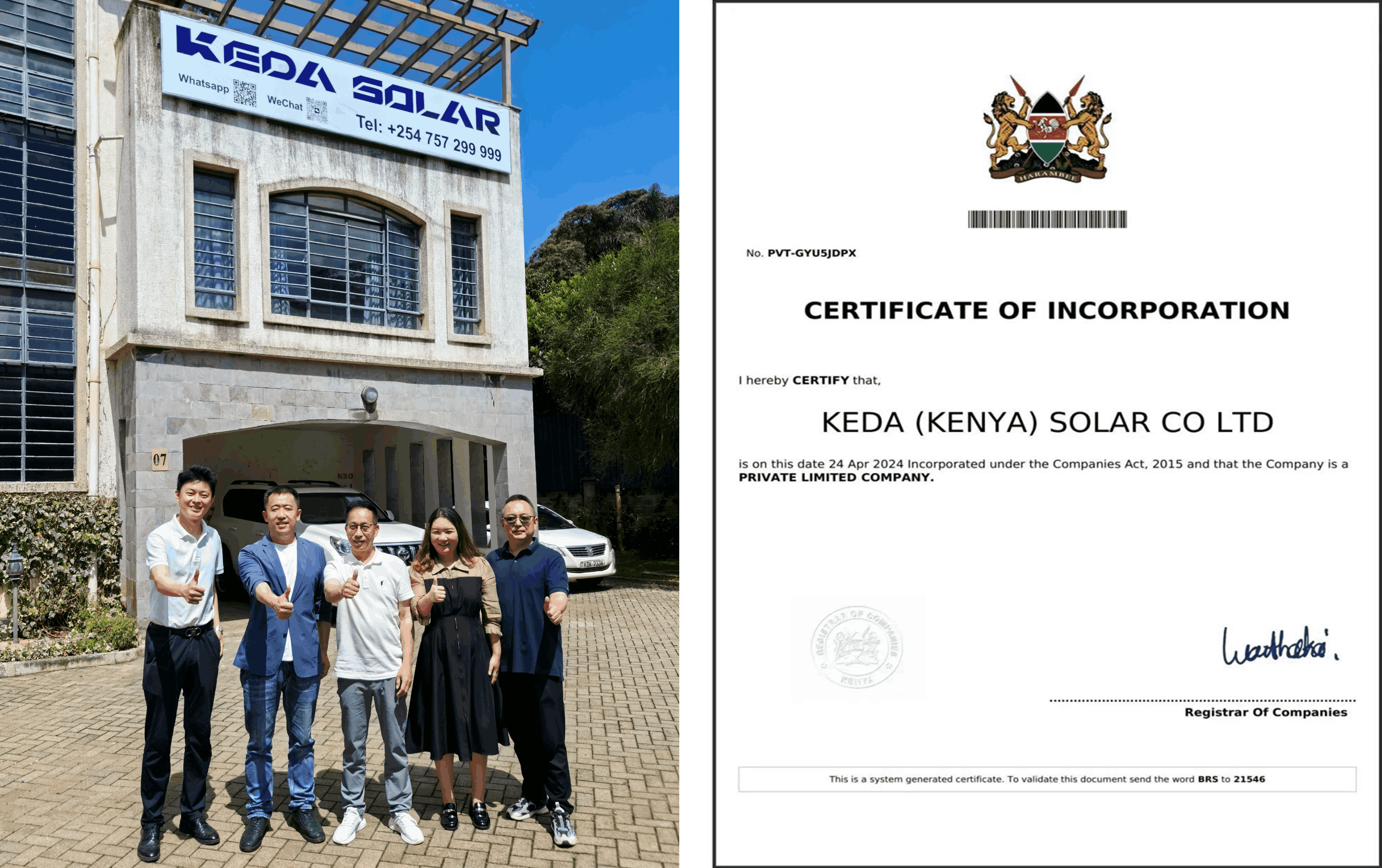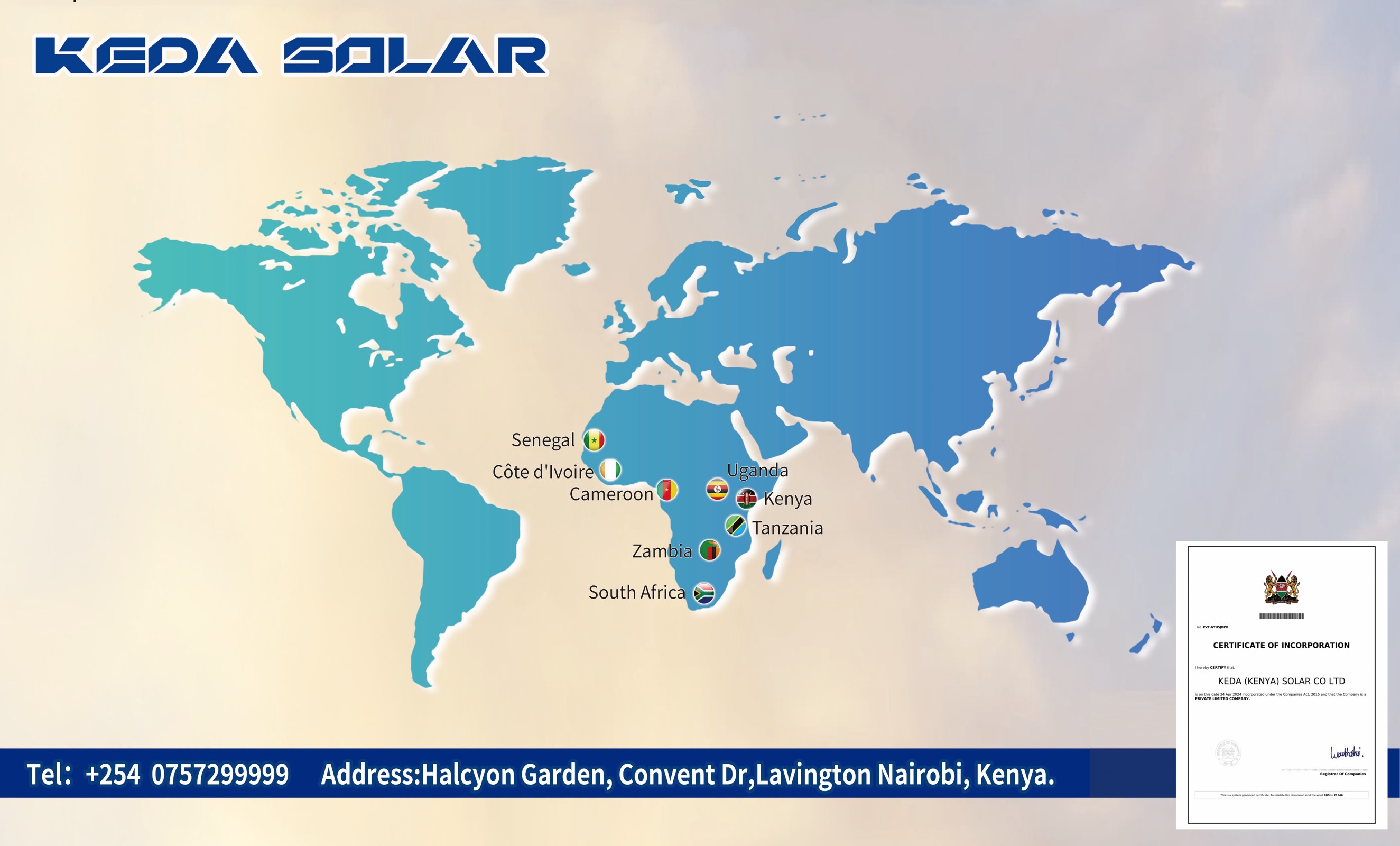 To meet market development needs, expand the market scale, and deeply implement the "Two Shan (Foshan & Ma'anshan) and One Sea (Overseas)" development strategy initiated by Anhui KEDA Smart Energy Technology Co., Ltd., the company has officially established KEDA SOLAR in Kenya (hereinafter referred to as KEDA SOLAR)!